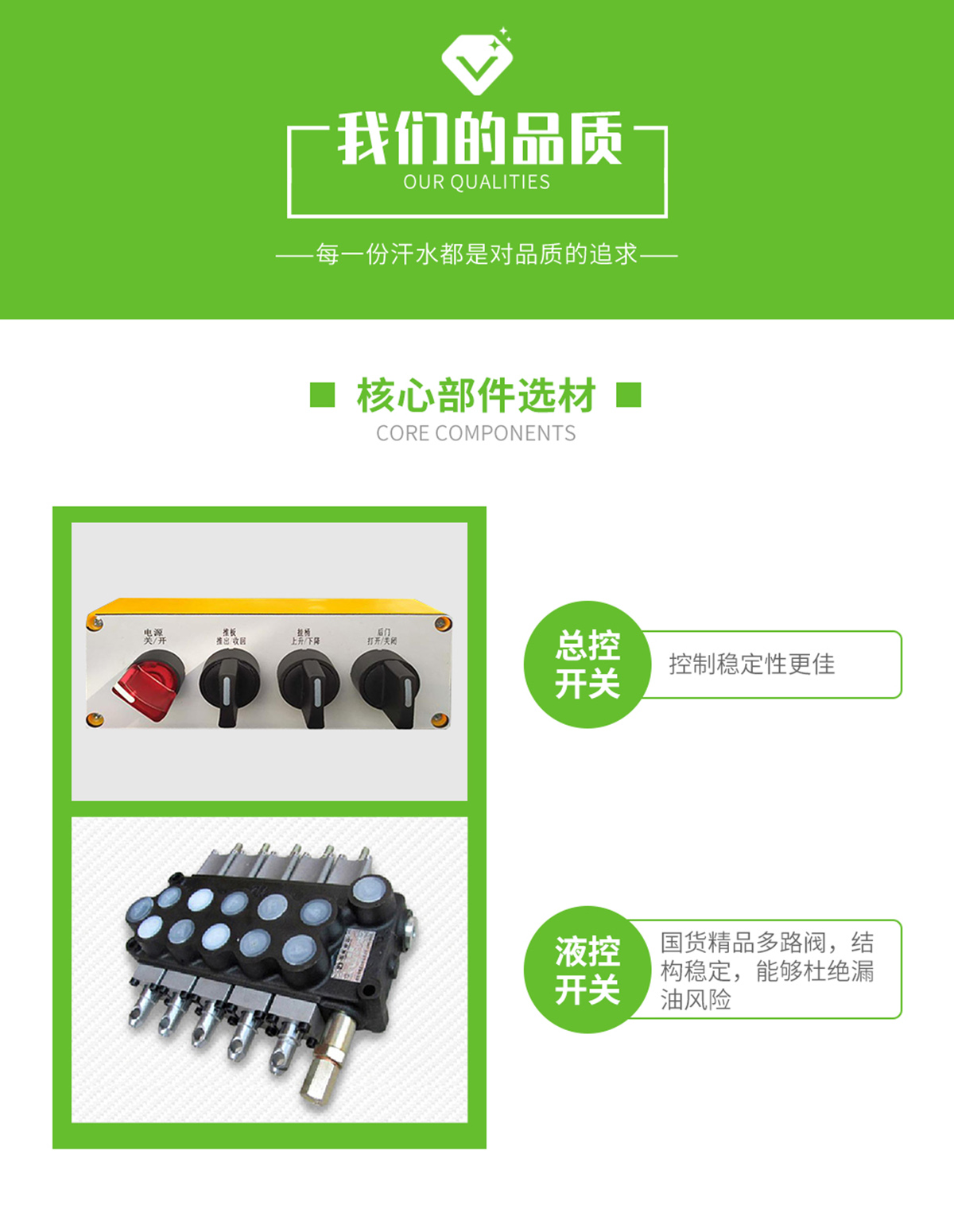采用機電液一體化,、液壓、電氣關鍵原器件均采用國際標準設計并采用模塊式液壓元件,性能穩定可靠。感應開關采用進口產品,經久耐用,性能優越。